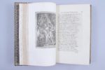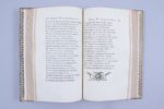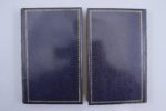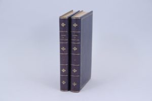 par Rigaud, gravé par Ficquet ; titre ; III-XIV pp ; (1 f. ) pour un fleuron de Choffard ; 268 pages, (1 f.). Tome II : Faux-titre ; portrait de Eisen par Vispré, gravé par Ficquet ; titre ; (1 f) pour un fleuron de Choffard ; III-VIII pp. ; 306 pp.; (2 ff). Plein maroquin bleu nuit à grain écrasé ; roulette d'encadrement sur les plats ; dos à 5 nerfs soulignés par un filet au pointillé ; filet sur les coupes ; large roulette intérieure. Toutes tranches dorées. Reliure parfaitement établie dans la seconde partie du XIXème siècle. (Le cahier i du tome I a quelques rousseurs. Restauration d'une déchirure marginale, loin du texte, aux pages 137-140 du tome II). Bel exemplaire de la "Réimpression intégrale, sur bon papier, de l'édition dite des Fermiers Généraux" (Rochambeau). Elle est illustrée de 2 portraits, 83 figures hors-texte de Eisen, 53 culs de lampe, etc... Cette édition "contient les véritables gravures de l'édition de 1762, les planches et une partie du tirage ayant été mises sous séquestre jusqu'à cette époque" (Rochambeau citant Claudin). Les nouveaux culs-de-lampe de Choffard sont tirés sur papier de Chine, alors que l'ouvrage est tiré sur vergé fin. Un prospectus de l'éditeur, reproduit par Cohen, explique que le nombre des figures est augmenté de 4 (3 planches de Eisen et un cul de lampe de Choffard) par rapport à l'édition des Fermiers Généraux : "Il y a quatre gravures d'augmentation ...Nous ignorons les motifs qui les avaient fait manquer aux exemplaires qui ont été vendus [en 1762], ayant trouvé les cuivres et les figures de tirés". "Cette édition, rare à trouver, aurait été imprimée par Plassan pour employer des suites de figures tirées en 1762 et non utilisées" (Rochambeau). "Cette édition contient les planches de l'édition dite des Fermiers Généraux, qui avaient été tirées à plus grand nombre que les exemplaires du texte imprimé. Les planches manquantes ont été refaites en contre-épreuves. On y a ajouté aussi un certain nombre de planches qui avaient été refusées et n'avaient pas paru dans l'édition de 1762. Ces planches, connues sous le nom de planches doubles et dont le nombre varie selon les exemplaires, font rechercher cette édition." (Rochebilière) (Cohen, col. 311-312 ; et 309-310 pour le prospectus. Rochambeau, n°101, pages 531-532. Rochebilière, n°163)