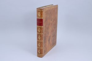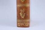 intérieures 310 X 232 mm. XX et 335 pages. Plein veau blond flammé, roulette d'encadrement à la clé grecque, bordée par une large roulette à décor de rinceau ; dos sans nerf avec grand fer à la lyre 5 fois répété ; pièce de titre de maroquin rouge. Filet aux pointillés sur les coupes. Roulette aux sphères sur les chasses. Gardes de papier à la cuve blanc, jaune et bleu. Toutes tranches dorées. Reliure signée "Bozérian" en queue. (Infimes épidermures à peine visible sur le plat supérieur. Rousseurs éparses, presque inévitables sur le papier vélin de cette période). Superbe impression sur papier vélin de Pierre Didot (1761-1853), illustrée de 5 gravures sur cuivre du baron Gérard (1770-1837). En 1797, Pierre Didot obtint la médaille d'or à l'Exposition Nationale. On l'autorisa alors à installer ses presses au Louvre, dans le local de l'ancienne Imprimerie Royale. Il y resta jusqu'en 1805, et publia les célèbres " Editions du Louvre", réputées pour leur perfection typographique. Il choisit comme illustrateurs Prudhon, et des élèves de David, le grand peintre de la période, le baron François Gérard (1770-1837), Gros et Girodet. "Ces splendides volumes sont un véritable manifeste de l'art néo-classique". (André Jammes) (Cohen, col. 319. Rochambeau, n°26 page 597. André Jammes : Alde, Renouard et Didot, page 18)
