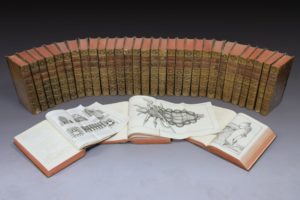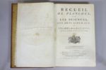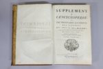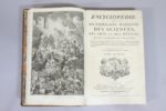 Lettres de Prusse ; & quant à la partie Ma-thématique par M. d'Alembert de l'Académie Royale des Sciences de Paris, de celle de Prusse, & de la Société Royale de Londres. Paris, Amsterdam, 1751-1777. 33 volumes in-folio (sur 35 : les deux volumes de Table publiés en 1780 manquent). Reliures du temps en veau ra-ciné. Bien complet du frontispice et des 3129 planches. Les dos des tomes I à VII sont ornés de fers « à la gre-nade » et ont des gardes de papier à la cuve. Tous les au-tres volumes présentent un dos orné d’un fer « à la rose des vents », encadré de quatre fers « au ruban » ; leurs gardes sont de papier peigné ocre. Tranches rouges. (Rousseurs habituelles. Reliures défraîchies ; coiffes et coins souvent endommagés ; épidermures et défauts divers. Les tomes IX et XVII du texte ainsi que les tomes III et VII du Supplément du texte présentent de fortes mouil-lures dans les marges, avec, par endroits, risque de dé-litement du papier.) Tous les volumes sont de premier tirage. Les tomes I à VII sont publiés à Paris de 1751 à 1757 à l’adresse de Le Breton, Briasson, David l’Aîné et Durand. Le tome I est bien complet de la planche dépliante intitulée « Sys-tème figuré des connoissances humaines » (avec déchi-rure, sans manque), et du carton, rarement signalé, page 762, pour l’article Asple avec la mention : « Supprimez l’article Asple tout entier et remplacez le par ce qui suit…» Ces sept premiers volumes, auxquels participèrent Voltaire, Rousseau, Montesquieu aux côtés de Diderot et d’Alembert furent interdits par le Censeur royal et mis à l’Index par Rome et l’édition s’ interrompit pendant 8 ans. Les tomes VIII à XVII sont imprimés à Paris par Le Breton, de manière clandestine, sous la fausse adresse de Samuel Faulche à Neuchâtel ; ils portent la date de 1765, et n’ont pas de faux-titres. Le tome XIII, dont le titre est maladroitement remonté, est bien complet de la « Table pour trouver les diviseurs des nombres jusqu’à 100 000 », placé à la fin du volume, et paginée de 1 à 34. Les quatre volumes de Supplément du texte sont édités par Rey, d’Amsterdam, et Panckoucke, Stoupe et Brunet, de Paris, sous la direction de J.B. Robinet, en 1776-1777. Les onze premiers volumes de planches paraissent de 1762 à 1772 chez les libraires associés parisiens. La Suite du Recueil de planches (ou douzième volume) est publiée par Panckoucke, Stoupe et Brunet, à l’adresse d’Amsterdam, en 1777. Les 3129 planches, en grande partie dépliantes, gravées sur cuivre, sont en bon état. Diderot et d’Alembert se sont entourés de plus de cent cinquante collaborateurs, recrutant les écrivains et phi-losophes, les artistes et artisans, les médecins et scien-tifiques les plus célèbres de leur temps, parmi lesquels Voltaire, Rousseau, Montesquieu, d’Holbach, Condor-cet, Buffon, Turgot, Necker, Tronchin, l’horloger Ber-thoud etc… Cette première édition est la plus rare et de loin la plus importante historiquement. Elle est considérée comme le monument de la pensée et de l’édition française du Siècle des Lumières, Son succès–malgré son prix considérable en souscrip-tion- fut retentissant, et entraîna des réimpressions et contrefaçons à Genève, Lucques, Livourne etc… (En français dans le texte, BN, 1990, n°156)