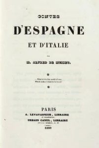 Musset (Alfred de). Contes d’Espagne et d’Italie. Paris, A. Levavasseur, Urbain Canel, 1830. In-8, viii-238 pp., 3 cartons pour les pp. 21-22, 75-76 et 207-208, demi-veau brun, dos à nerfs fileté de noir et de pointillés dorés, tranches