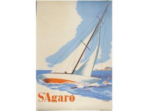 1947. (VELA). MONENY: S'AGARO. FESTIVALES NAUTICOS. Barcelona: Rieusset. Litografia. 50x35cm. (19,8x13,8 in.). A. Cartel sin el texto promocional.