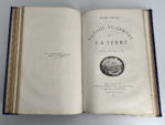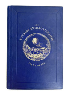 Cartonnage éditeur personnalisé en percaline bleue cobalt de type 2 avec les mentions «Voyages extraordinaires» et «Jules VERNE. — » sur le premier plat avec, au centre, une vignette montrant le ballon désemparé du professeur Fergusson et la faune antédiluvienne des entrailles de la Terre. Lenègre relieur. Tranches dorées. Gardes gris d'origine. Imp. Bonaventure.