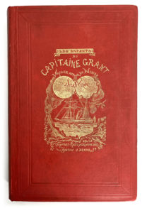 Cartonnage éditeur personnalisé en percaline orange portant les mentions «Les Enfants / du capitaine Grant / Voyage autour du Monde / par / Jules VERNE. — / Les Voyages Extraordinaires / Edition J. Hetzel» avec, au centre, une vignette représentant le Duncan voguant ainsi qu'un paysage côtier où marche un personnage et un planisphère. Magnier relieur. Tranches dorées. Gardes beige-mauve. Imp. Jules Bonaventure.