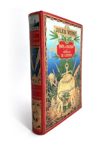 Cartonnage éditeur en percaline polychrome «au globe doré» (type «4») avec dos au phare, relié par Engel (second plat type «I»). Tranches dorées. Gardes d'origine. Imp. Belin frères.