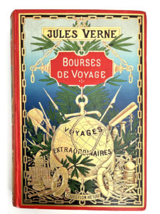 Jules VERNE. — Bourses de Voyage. Ill. par Benett, 12 grandes chromolithographies, deux cartes. Paris, Bibliothèque d'éducation et de récréation, J. Hetzel. S.D. (1904). Grand in. 8 double.
