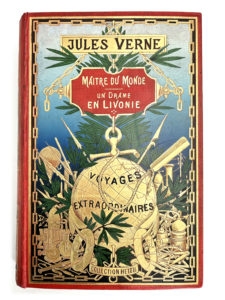 Jules VERNE. — Maître du Monde / Un Drame en Livonie. Ill. par Roux (Maître du Monde), Benett (Un drame en Livonie), 12 grandes chromolithographies. Paris, Bibliothèque d'éducation et de récréation, J. Hetzel. S.D. (1904). Grand in. 8 double.