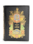 Cartonnage éditeur en percaline mosaïquée avec plats et dos personnalisés. Portrait de La Fontaine et d'animaux divers sur le premier plat. Scène représentant le corbeau et le renard sur le dos. Tranches dorées.