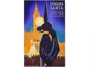 1941. (TURISMO). SEMANA SANTA. Almería, Cédiz, Córdoba, Granada, Huelva, Jaén, Mélaga, Sevilla. Madrid: Dirección General de Tursimo. Litografía. 100X70 cm. (39,5x27,5 in.). B +. Pequenas rasgaduras en los margenes sin pérdida.