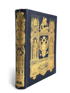 Cartonnage éditeur en percaline bleue avec plats et dos personnalisés. Tranches dorées.