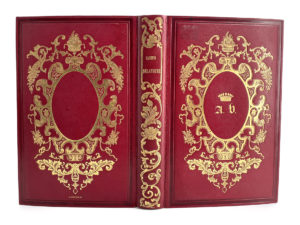 Reliure en plein chagrin rouge de Giroux (étiquette au verso de la garde et inscription au bas du 2nd plat) avec un dos richement orné à la Boutigny. Les deux plats sont composés d'un riche décor doré avec flammes sortant d'une vasque, de têtes de satyres. Cornes d'abondance et motifs floraux. Médaillon armorié au centre du premier plat (armes du comte, Amédée de Virieu). Tranches dorées.