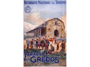 1960 ca. (TURISMO). DOMINGO, ROBERTO: PARADOR DE GREDOS. Madrid: Lit. Mateu. Ed. PATRONATO NACIONAL DEL TURISMO. Litografía. 100x70 cm. (39x27,5 in.). B-. Rasgadura en el margen superior sin pèrdida. Falta en la esquina superior derecha y en la...