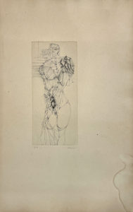 BELLMER Hans — Gravure originale légendée E.A. et signée par l'artiste, représentant une jeune femme relevant sa robe. 18,5 x 8,2 cm