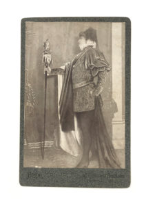 [BERNHARDT Sarah] MANUEL Henri — Photographie de Sarah Bernhardt. Photographie en noir et blanc de Sarah Bernhardt en pied dans le rôle de Jacasse dans «Les Bouffons» drame de Miguel Zamacoïs.par Henri Manuel, 27 rue du faubourg Montmartre. 14...