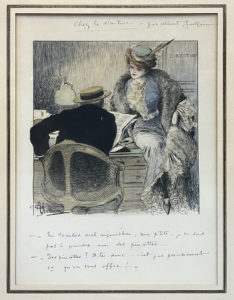 GUILLAUME Albert — Chez le directeur. Dessin original signé ayant servi à la couverture du Journal Amusant le n°295, du 18 février 1905. Encre de Chine et aquarelle, 33,5 x 24,5 cm, encadré.