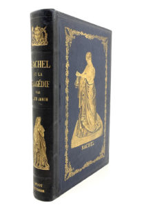 chagrin éditeur avec premier plat personnalisé orné d'une guirlande florale et représentant Rachel dans le rôle de Monime, petit cadre floral sur le second plat., dos lisse orné de deux personnages, Rachel en Phèdre dans la partie inférieure et un personnage avec des attributs liés au théâtre sur le haut, tranches dorées, petites craquelures aux charnières ; ex-Libris de Jacques Crépineau.