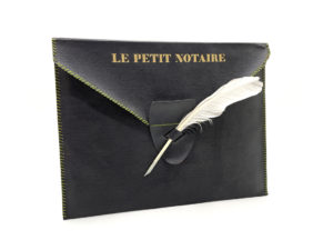 Broché in-8 sous serviette notariale imitant le cuir, noir à coutures vertes, et fermée par une plume d'oie.