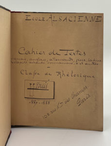 LOUŸS Pierre — Cahier de textes français, anglais, allemands, grecs, latins, volapüks, achautis, comoriens, 7 et 8 autres. Classe de rhétorique. A l'école Alsacienne. Année 1887-1888 au 105 rue Notre-Dame des Champs Paris, signé «P.F....