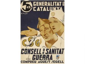 1936 ca: (GUERRA CIVIL Y REPUBLICA). VICENTE, E.: GENERALITAT DE CATALUNYA. CONSELL DE SANITAT DE GUERRA. COMPREU AQUEST SEGELL. Litografia. 49x34 cm. Marca de doblez en la parte central. A -.