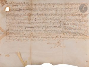 [AIN]. [GEX] Testament de Anne Girod de Chevrier En français, acte sur parchemin France, Gex, 1590 Dimensions : 350 x 400 mm Joint : [AIN]. [GEX]. Acte de vente de terres au profit d’Etienne Duval, procureur à Gex, France, Gex, 1585. Dimensions : 362 x 260 mm