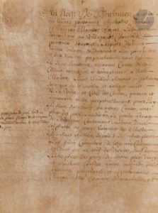 [SAÔNE ET LOIRE]. [OUROUX-SUR-SAÔNE (COLOMBEY)]. Contrat d’acquêt entre Pierre Guillier maire de Chalon et Antoine, Benoit et Jacques Mansset frères pour des terres au finage de La Rongere En français, acte sur parchemin (2 pp.) France, Chalon, 1671 Dimensions : 182 x 247 mm