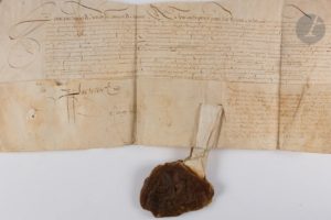 [LOUIS XIII]. [BOURGOGNE]. Acte relatif à un office accordé à Jacques Fitzjean (Fijan), avocat au Parlement de Bourgogne En français, acte sur parchemin, avec sceau de cire (Louis XIII, en partie accidenté) France, Nantes (?), 4 août 1626 Dimensions : 520 x 230 mm