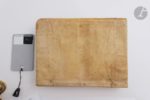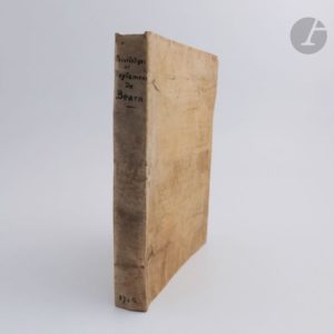 [BÉARN]. Compilation d'auguns priviledges et reglamens deu pays de Bearn, feyts et octroyats a l'intercession deus Estats, ab los serments de fidelitat deus seignors a soos subjects, et per reciproque deus subjects a loor seignor. Pau : Isaac Desbaratz, 1716. — In-4, parchemin simple, dos lisse (reliure de l'époque). Troisième édition des privilèges et règlements des États du Béarn, rédigée en très grande partie en gascon. Elle a été imprimée à Pau et succède à celles publiées à Lascar en 1633 et à Orthez en 1676. Elle n'aurait été tirée qu'à 600 exemplaires. Exemplaire portant sur le titre la signature de Castaing-Foix. Il s'agit très probablement de l'avocat et notaire royal apostolique du diocèse de Lescar Jean-Baptiste de Castaing-Foix. Une note certainement de sa main couvre la première garde, se rapportant aux délibérations de 1710 et de 1718 tenues à Lescar sur la langue béarnaise, et sur un arrêt de 1706 concernant les receveurs de tailles. Bon exemplaire en reliure de l'époque. Note de Castaing-Foix en grande partie effacée sur le premier plat. Les indications portées au dos sont postérieures. Rousseurs.