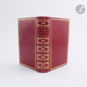 LE CABINET SATYRIQUE ou recueil parfaict, des vers piquans & gaillards de ce temps. Tiré des secrets cabinets des Sieurs de Sigognes, Regnier, Motin, Berthelot, Maynard & autres des plus signalez Poëtes de ce siècle. Nouvelle Edition, reveuë, corrigée, & de beaucoup augmentée. Paris : Pierre Billaine, 1614 [1623]. — In-12, maroquin rouge, triple filet doré en encadrement sur les plats, dos à nerfs orné, dentelle dorée intérieure, tranches dorées (Godillot). Nouvelle édition rare de cette anthologie de pièces licencieuses parue pour la première fois en 1618 et remaniée en 1619. Elle est illustrée d'un joli frontispice non signé. Le titre porte la fausse date de 1614. Certains exemplaires comportent celle de 1613. Très bel exemplaire en maroquin rouge signé de Godillot. Marge supérieure un peu courte.