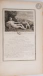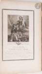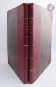 COUCHÉ (Jacques). Galerie du Palais Royal gravée d'après les Tableaux des différentes Écoles qui la Composent : Avec un abrégé de la Vie des Peintres & une description historique de chaque tableau par Mr l'abbé de Fontenai. Paris : J. Couché, J. Bouilliard, 1786. — 2 volumes in-folio, demi-maroquin rouge à coins, dos à nerfs, tête dorée, non rogné (A. Bertrand). Superbe recueil de gravures interprétées en taille-douce principalement par Jacques Couché, reproduisant la collection de peintures des plus grands maîtres italiens, flamands et français, constituée par le Régent. Il s'agit de l'un des rares témoignages de cette riche collection privée, dispersée durant la Révolution. L'ouvrage fut publié en 59 livraisons. Les exemplaires complets sont d'une extrême rareté. Celui-ci contient le titre gravé du premier tome, la dédicace au duc d'Orléans, gravée d'après Choffard et 192 planches sur les 355 parues, le tout monté sur onglets. Il fut relié par Adolphe Bertrand dans la seconde moitié du XIXe siècle. Épidermures aux reliures, coins émoussés, traces de mouillures sur la reliure du second tome. Rousseurs, bords des feuillets brunis. Mouillures claires dans le second volume, atteignant rarement les gravures.