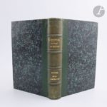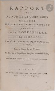 COURTOIS (Edme-Bonaventure). Rapport fait au nom de la commission chargée de l'examen des papiers trouvés chez Robespierre et ses complices. Paris : Imprimerie nationale des lois, Nivôse an III de la République [1795]. [Suivi de] : [MONTJOIE (Galart de)]. Histoire de la conjuration de Maximilien de Robespierre. Paris : Les Marchands de nouveautés (impr. par Strockenster à Lausanne), [1795]. — 2 ouvrages en un volume in-8, demi-basane verte, dos à nerfs orné de filets dorés, tranches mouchetées (reliure du XIXe siècle). Édition originale du célèbre rapport du conventionnel Courtois (1754-1816), ami de Danton, présenté lors de la séance de la Convention Nationale du 5 janvier 1795, six mois après la déchéance et la mort de Robespierre. Ce livre est très important pour connaître le rôle et la carrière révolutionnaire du célèbre homme politique. Il réunit 121 pièces justificatives : correspondances, essais politiques, etc. A été reliée à la suite l'édition originale de l' « Histoire de la conjuration de Maximilien de Robespierre » de l'avocat et publiciste Galart de Montjoie (1746-1816) que Louis XVIII nommera conservateur à la bibliothèque Mazarine en 1816. Dos passé, Traces de frottements d'usage.