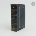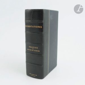 *GROTIUS (Hugo). Dissertationes De Studiis instituendis. Amsterdam : Louis Elzevier, 1645. — In-12, maroquin bleu foncé, double encadrement de filets à froid et dorés avec fleuron doré aux angles sur les plats, dos à nerfs orné de motifs dorés et à froid, filets dorés intérieurs, gardes de parchemin, non rogné, emboîtage demi-maroquin noir (Simier R. du roi pour la reliure et James Macdonald à New York pour l'emboîtage). Willems 1028. Édition publiée la même année que celle donnée par Louis Elzevier à Amsterdam, imprimée dans la même ville par Joan Blaeu. Elle possède le même titre gravé mais une pagination différente. Nous reprenons ce que dit Willems sur ce livre. Il s'agit d'un « recueil intéressant, comprenant vingt-quatre dissertations sur la meilleure méthode à suivre dans l'étude des lettres et des sciences. Composées par des juges aussi compétents dans la matière que les Grotius, les Naudé, les Érasme, les Barlæus, les Campanella, &c., ces dissertations renferment quantité de vues ingénieuses et pratiques ». Précieux exemplaire à toutes marges, relié par Simier et aux provenances prestigieuses. Il proviendrait en premier lieu de la bibliothèque de l'éditeur et bibliophile Antoine-Augustin Renouard (1765-1853), pour qui la reliure aurait été faite. La présence de gardes en parchemin est l'un des indices de cette provenance. Il rentra par la suite en possession du grand bibliophile américain Mortimer Leo Schiff (1877-1931) qui fit faire de son côté l'emboîtage par le relieur James Macdonald (1859-1920) à New York, puis du bibliophile anglais John Hely-Hutchinson (1881-1955) et de Charles Van der Elst, président de la Société des bibliophiles et iconophiles de Belgique. Exemplaire parfaitement conservé. Provenance : Antoine-Augustin Renouard. - Mortimer Leo Schiff, avec ex-libris (cat. décembre 1938, n° 1597). - John Hely-Hutchinson, avec ex-libris (cat. 1956, n° 326). - Charles Van der Elst, avec ex-libris (cat. I, 1985, n° 99).