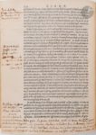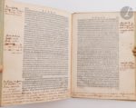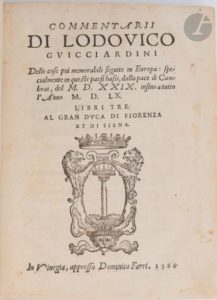 GUICCIARDINI (Lodovico). Commentarii di Lodovico Guicciardini Delle cose più memorabili seguite in Europa : specialmente in questi paesi bassi, dalla pace di Cambrai, del M. D. XXIX. insino a tutto l'Anno M. D. LX. Venise : Domenico Farri, 1566. — In-4, parchemin rigide, dos lisse, tranches bleues (reliure du XVIIIe siècle). Troisième édition dédiée au grand duc de Florence et de Sienne, de cet ouvrage de l'écrivain et historien florentin Lodovico Guicciardini (1521-1589). L'auteur raconte dans trois parties les choses les plus mémorables qui se sont passées en Europe, essentiellement aux Pays-bas, depuis la paix de Cambrai en 1529 jusqu'en 1560. Les deux précédentes éditions parurent en 1565, à Venise et à Anvers. Bon exemplaire en reliure italienne du XVIIIe siècle. Il est enrichi de nombreuses notes manuscrites portées par un lecteur italien du XVIe siècle dans la marge. Quelques rares traces de mouillures claires, rousseurs éparses. Restauration à l'angle inférieur du feuillet A2, avec atteinte à un mot. Les notes manuscrites ont été légèrement coupées par le relieur. Provenance : Le Gonidec de Traissan, avec ex-libris du XIXe siècle.