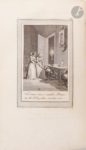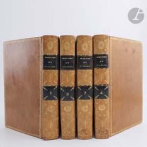 LESAGE (Alain René). Histoire de Gil Blas de Santillane. Paris : Janet, Hubert, l’an troisième [1795]. — 4 volumes in-8, veau blond, roulette dorée en encadrement sur les plats, dos lisse orné, roulette dorée intérieure, tranches dorées (reliure de l'époque). Très belle édition illustrée de cent figures hors texte gravées sous la direction de Hubert d’après les dessins de Bornet, Charpentier et Duplessis-Bertaux. Très bel exemplaire en reliure de l'époque, d'une grande élégance. Dos très légèrement éclairci. Quelques minimes frottements d'usage et petites taches sur les plats.