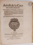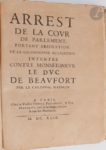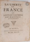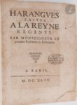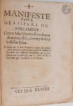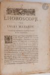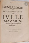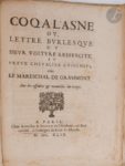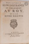 MAZARINADES. Recueil factice de 136 mazarinades parues en 1648 et 1649. Paris, 1648-1649. — 136 brochures en 2 volumes in-4, parchemin souple, dos lisse, non rogné (reliure de l'époque). Précieux ensemble de 136 mazarinades publiées en 1648 et 1649, c'est-à-dire parmi les premières parues durant la Fronde. La toute première fut publiée vers la fin de 1648 ; il s'agirait de « La Requête des trois états du Gouvernement de l’Île de France au Parlement de Paris ». Elle ne figure hélas pas dans ce recueil. Le premier volume contient 76 pièces et le second 60. Il s'agit de documents originaux de l'époque, chacun avec une pagination particulière. En voici quelques titres : « Relation veritable de ce qui s'est passé à S. Germain en la deputation de la Cour des aydes, pour le retour de leurs Majestez à Paris. Avec la harangue & replique de M. Amelot pr. president sur ce sujet » - « Arrest de la cour de Parlement portant absolution de la calomnieuse accusation intentée contre monseigneur le duc de Beaufort par le cardinal Mazarin » - « Arrest de la cour de Parlement, portant defenses a toutes personnes estans en cette ville & faux-bourgs de Paris, de changer leurs noms, & de se travestir & déguiser, pour sortir de ladite ville, sur peine de la vie » - « Manifeste pour messieurs de Parlement contre Jules Mazarin Perturbateur du repos public, ennemy du Roy & de son Estat. Exortant tous les bons François de suyvre & proteger ceux qui n'ont point d'autre dessein de remettre le Roy dans son authorité accoustumée par la descision de trois poincts qui sont le service du Roy le bien public & l'exemption de la Tirranie » - « L'Horoscope de Jules Mazarin, Extraicte & naisvement expliquée des Centuries de M. Nostradamus » - « Genealogie ou, extraction de la vie de Jule Mazarin » - « Lettre de consolation envoyee a madame la duchesse de Rohan, sur la mort de feu monsieur le duc de Rohan son fils, surnommé Tancrede » [par Savinien de CYRANO DE BERGERAC] - « La France vengée des malheurs dont elle estoit menacée par les armes de Jules Mazarin » - « Agreable recit de ce qui s'est passé aux dernieres barricades de Paris. Descrites en vers burlesques » - « Coq-a-l'asne, ou Lettre burlesque du sieur Voiture ressuscité, au preux chevalier Guischeus, aliàs le mareschal de Grammont. Sur les affaires & nouvelles du temps » - « La verité reconnue, ou Les intrigues de Sainct Germain » [par le Cardinal de RETZ] - « Instruction prompte et facile, aux parisiens pour bien apprendre l'exercice du Mousquet & de la Picque, & les rendre parfaits en l'Art militaire ». etc. Ces 136 pièces ont été publiées à la fin de 1648 ainsi qu'en janvier et février 1649. Elles ne sont que les premières d'une longue série de pamphlets et de libelles, qui comptera plusieurs milliers de publications jusqu'en 1653. Importants manques en haut des dos, sur le haut du premier plat du premier volume, et sur les bords des plats. Gardes renouvelées. Les feuillets sont comme souvent brunis ou présentent des rousseurs. On relève des restaurations à quelques rares brochures, l'une avec atteinte au texte. Une ou deux brochures semblent incomplètes.