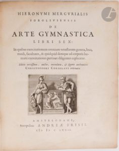 MERCURIALE (Girolamo). De arte gymnastica libri sex : In quibus exercitationum omnium vetustarum genera, loca, modi, facultates, & quidquid denique ad corporis humani exercitationes pertinet diligenter explicatur. Amsterdam : Andreas Frisius, 1672. — In-4, parchemin rigide à recouvrement, dos lisse (reliure de l'époque). Nouvelle édition, l'une des plus estimées du premier grand traité de gymnastique publié depuis l’Antiquité constituant la première véritable somme scientifique concernant l’activité physique. Le médecin Girolamo Mercuriale (1530-1606), originaire de Forli, a écrit cet ouvrage à une époque charnière de la pensée universelle, riche en bouleversements. Copernic laissait apercevoir un espace sidéral où la terre n’était plus le centre de l’univers, Vésale faisait glisser la vision du corps alors fantasmée à une vision plus réaliste, et le concile de Trente, lié à l’avènement du protestantisme, introduisait un monde sans intermédiaire entre Dieu et l’Homme. Ce que Vésale a produit pour l’anatomie, Mercuriale le réalisa pour la gymnastique dans cet « Arte Gysmnastica ». Il y propose une synthèse exhaustive de tout ce qui a été produit dans le passé, professe une gymnastique hygiénique et curative, et réalise ainsi une sorte de vaste encyclopédie des exercices corporels et des sciences qui permettent d’analyser le mouvement. L’ouvrage parut pour la première fois en 1569. Il est divisé en six chapitres, les premiers forment une collection exhaustive des exercices qui s’inscrivent dans la même démarche que celle de Vésale, et les chapitres IV à VI évoquent les exercices les mieux adaptés à l’entretien ou à l’amélioration de la santé. Cette édition est illustrée de dix compositions gravées sur cuivre, dont un frontispice attribué à Romein de Hooghe, une vignette de titre, une vignette dans le texte et sept planches, dont cinq dépliantes, ainsi que de vingt-six autres compositions, dont vingt-et-une à pleine page et cinq dans le texte, gravées sur bois par Cristofo Coriolano d’après Pirro Ligorio, que l'on trouvait déjà dans les éditions précédentes. Bon exemplaire en reliure de l'époque. Léger manque à la coiffe inférieure, quelques salissures au dos et sur les plats. Rousseurs éparses.
