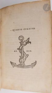 QUINTE-CURCE. Quintus Curtius. [Venise] : Alde [André d'Asola et ses fils], juillet 1520. — In-8, parchemin rigide, dos lisse, tranches marbrées (reliure du XIXe siècle). Première et seule édition aldine rare, de « L'Histoire d'Alexandre le Grand » de l'historien romain Quinte-Curce. Elle fut imprimée en caractères italiques par André d'Asola et ses fils qui prirent la succession d'Alde Manuce à sa mort en 1515. La préface est de François d'Asola, adressée à Mapheo Leoni. On retrouve l'ancre aldine sur le premier et le dernier feuillet. Bon exemplaire en reliure du XIXe siècle à l'imitation. Or du dos effacé. Quelques mouillures claires sans gravité.