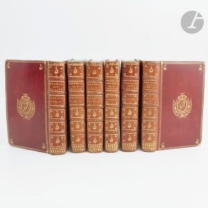 SEGAUD (Guillaume de). Sermons du Père de Segaud de la Compagnie de Jésus. Paris : Hippolyte-Louis Guerin, 1750 [Carême tomes 1 et 2] ; Paris : J. B. Coignard, A. Boudet, 1750 [Carême tome 3, Avent, Panégyriques] ; Paris : Marc Bordelet, 1750 [Mystères]. — 6 volumes in-12, maroquin rouge, triple filet doré en encadrement, dauphin doré aux angles et armes dorées au centre sur les plats, dos à nerfs orné de dauphins dorés, roulette dorée intérieure, tranches dorées sur marbrures (reliure de l'époque). Première édition des sermons du prédicateur et père jésuite Guillaume de Segaud (1675-1748), dédiée à Louis, dauphin de France (1729-1765), publiée par les soins d'Isaac-Joseph Berruyer (1681-1758) qui a ajouté à la fin de chaque volume une analyse de chacun des textes. L'un des volumes est consacré aux panégyriques du père Segaud. La dédicace au dauphin figure dans le tome consacré aux sermons de l'avent. PRÉCIEUX EXEMPLAIRE DE DÉDICACE AUX ARMES DE LOUIS, DAUPHIN DE FRANCE, quatrième enfant de Louis XV, dauphin de 1729 à 1765. Il épousa l'infante Marie-Raphaëlle d'Espagne le 23 février 1745 puis Marie-Josèphe de Saxe le 9 février 1747. Il fut le père de Louis XVI, de Louis XVIII et de Charles X. Dos passés, fente à plusieurs charnières, celle du premier plat du premier volume des sermons pour le carême est très fragile, le plat est en partie défait. Coins émoussés, quelques coiffes arasées. Un cahier mal placé dans le volume de l'avent. Provenance : Louis de France, avec ses armes sur les plats. - L. Pasquier, avec ex-libris.