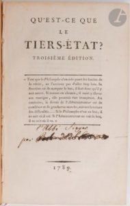 [SIEYÈS (Emmanuel-Joseph)]. Qu’est-ce que le Tiers-État ? Troisième édition. S.l. [Paris], 1789. — In-8, dérelié, sous couverture de papier moderne. Troisième édition sur les quatre parues en quelques semaines, de ce pamphlet devenu un classique de la littérature politique européenne. Il est l’œuvre de l’abbé Sieyès (1748-1836), vicaire général de Chartres et théoricien révolutionnaire, qui le fit paraître en janvier 1789 au moment de la campagne électorale précédant la convocation des États généraux. « L’ouvrage devait incarner les revendications radicales d’un Tiers État d’autant plus impatient de s’émanciper qu’il est ici conçu comme étant l’expression de la nation entière » (En français dans le texte, 186). Il est célèbre notamment à cause de son incipit donnant le plan et la teneur de l’ouvrage : « 1°. Qu’est-ce que le Tiers-Etat ? TOUT. 2°. Qu’a-t-il été jusqu’à présent dans l’ordre politique ? RIEN. 3°. Que demande-t-il ? A devenir QUELQUE CHOSE. » Selon Jacques T. Quentin, par ce texte Sieyès est devenu « l’inventeur de la représentation moderne et d’une pratique politique sur laquelle nous n’avons cessé de vivre. À cet égard, il est l’un des pères de notre droit public » (En français dans le texte). Exemplaire dérelié, sous couverture moderne.