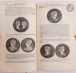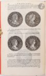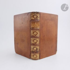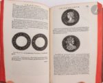 STRADA (Jacopo). Epitome thesauri antiquitatum… Tiguri [Zurich] : Andreas Gessner, 1557. — In-8, veau havane, dos à nerfs orné, tranches rouges (reliure du XVIIIe siècle). Seconde édition latine, après celle de 1553, illustrée de centaines de médailles et de monnaies gravées sur bois et reprenant celles de l'édition originale. Ces médailles, représentant des portraits d'empereurs depuis Jules César jusqu'à Charles Quint, ont été réalisés d'après les exceptionnelles collections numismatiques de l'antiquaire Jacopo Strada, de Guillaume du Choul, de Jean Grolier et de Claude de Bellièvre. Exemplaire en reliure allemande du XVIIIe siècle, provenant de la collection du bibliothécaire et historien allemand Andreas Felix von Oefele (1706-1780), précepteur des princes Maximilien et Clément de Bavière puis conservateur de la bibliothèque de Munich. Il comprend son ex-libris manuscrit sur le titre, son ex-libris imprimé, ainsi que sa signature, hélas effacée, au bas du titre. Il est également l'auteur des quelques notes figurant dans trois ou quatre marges. Travaux de vers au dos, à la coiffe inférieure, à deux coins et sur les bords inférieurs des plats. Découpure ancienne au titre réparée à l'aide de papier marbré sur lequel a été collé au recto la lettre S et au verso le mot « Thesaurus ». Mouillures claires.