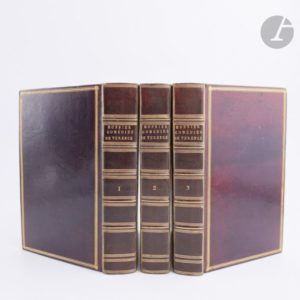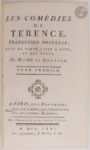 TÉRENCE. Les Comédies. Traduction nouvelle, avec le texte latin à côté, et des notes. Par M. l'Abbé le Monnier. Paris : Charles-Antoine Jombert père et fils, 1771. — 3 volumes in-8, maroquin violet, triple filet doré en encadrement sur les plats, dos à nerfs orné, roulette dorée intérieure, tranches dorées (reliure du XIXe siècle). Édition originale de la traduction par l'abbé Guillaume Antoine Lemonnier (1721-1797) des comédies de Térence. Elle est dédiée à la marquise de La Vaupallière, et illustrée, en premier tirage, d'un frontispice et de six belles planches, gravés par Choffard, Prévost, Rousseau et Saint-Aubin, d'après Cochin fils. Très bel exemplaire. Dos et bords des plats très légèrement passés. Rousseurs éparses.
