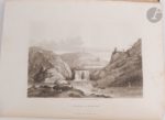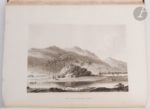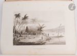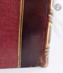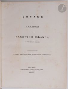 *BYRON (George Anson) - GRAHAM (Maria). Voyage of H. M. S. Blonde to the Sandwich islands, in the years 1824-1825. Londres : John Murray, 1826. — In-4, demi-veau bordeaux à coins, filets dorés, dos à faux nerfs orné, tranches marbrées (reliure de l'époque). Édition originale de ce récit du voyage entrepris entre 1824 et 1825 par le capitaine George Anson Byron (1789-1868), cousin du célèbre poète, à bord de la frégate H.M.S. Blonde, à destination des îles Sandwich. Il fut initialement réalisé pour ramener les corps du roi Kamehameha II et de la reine Kamāmalu, morts de la rougeole lors de leur visite d'État en Angleterre. Participèrent à cette expédition plusieurs scientifiques dont le prêtre, botaniste et naturaliste Andrew Bloxam (1801-1878). C'est à partir des papiers officiels et des journaux conservés par ce dernier, que l'autrice Maria Graham, plus tard Lady Callcott (1785-1842), écrivit ce livre à la demande de son éditeur John Murray. Elle y relate la visite du couple royal hawaïen à Londres, donne un résumé de la découverte et des visites britanniques des îles hawaïennes, et fait le récit du voyage de la frégate Blonde. L'édition est illustrée de deux cartes dont une dépliante, et de 13 planches dont 3 représentant des portraits d'habitants d'Hawaï gravés sur cuivre et 9 des paysages à l'aquatinte dont le frontispice dépliant. Travaux de vers aux charnières et sur les plats, quelques accrocs et épidermures, mouillures sur les gardes. Rousseurs. Provenance : Charles Scrase Dickins, avec ex-libris.