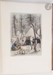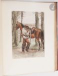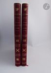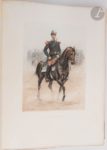 DETAILLE (Édouard). L'Armée française. Texte par Jules Richard. Paris : Boussod, Valadon et Cie, 1885-1889. — 2 volumes in-folio, demi-maroquin rouge à coins, dos à nerfs orné, tête dorée, non rogné (reliure de l'époque). Édition originale de l'un des plus beaux livres publiés sur l'Armée française au XIXe siècle, fournissant notamment de précieux renseignements sur les tenues des troupes de 1789 à 1883. Le tome I est consacré aux états-majors, aux écoles, à l'infanterie et à la cavalerie. Le second porte sur les armes spéciales, les corps indigènes et auxiliaires ainsi qu'à la marine. Cette édition se distingue par sa riche illustration d'après les dessins d'Édouard Detaille, comprenant 285 vignettes en noir dans le texte ainsi que deux frontispices en noir et 60 planches en couleurs, le tout reproduit en héliogravure. Exemplaire du tirage normal sur papier vélin, enrichi du premier plat de la couverture de la seizième et dernière livraison, relié en tête du premier volume, ainsi que de celui de la première livraison, dérelié, illustré au recto d'une composition en couleurs de Detaille et comprenant au verso la publicité pour l'édition de luxe de l'ouvrage. Bel exemplaire en reliure de l'époque. Dos légèrement brunis, petits frottements aux coins. Rousseurs éparses.