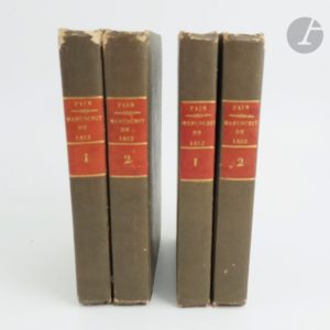 FAIN (Agathon Jean-François). Manuscrit de mil huit cent douze - Manuscrit de mil huit cent treize, contenant le précis des événemens de cette année, Pour servir à l'Histoire de l'empereur Napoléon. Paris : Delaunay, 1827-1829. — 2 ouvrages en 4 volumes in-8, cartonnage papier gris à la bradel, dos lisse, non rogné (reliure de l'époque). Ensemble de deux des trois ouvrages que le baron Fain, secrétaire de Napoléon, consacra au récit des événements de la chute de l'Empire. Il manque celui consacré à 1814. Le premier ouvrage est ici en édition originale. Il comprend 7 cartes dépliantes conçues par le capitaine Lameau, ingénieur-géographe qui était attaché en cette qualité au cabinet de Napoléon pendant les campagnes de 1812, de 1813, et de 1814. L'exemplaire sur l'année 1813 est ici en troisième édition comprenant trois cartes et un fac-similé hors texte d'une lettre de l'impératrice Marie-Louise. EXEMPLAIRES DU BARON RENÉ-NICOLAS DUFRICHE DESGENETTES (1762-1837), médecin militaire ayant participé à la campagne d'Égypte, devenu directeur du service de santé, inspecteur général du service de santé et médecin en chef des armées. Il fut élu en 1820 membre de l'Académie nationale de médecine. On trouve sur le haut des pages de titre des premiers tomes cet ex-dono manuscrit : « A Mr le Bon Desgenettes De la part de l'auteur. » Exemplaires en reliures uniformes. Usures et quelques manques aux coiffes, frottements d'usage sur les plats, coins émoussés. Très bon état intérieur malgré des rousseurs.
