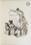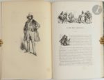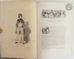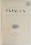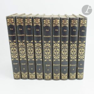 LES FRANÇAIS PEINTS PAR EUX-MÊMES, encyclopédie morale du dix-neuvième siècle. - Le Prisme. Paris : L. Curmer, 1840- . — 9 volumes in-8, demi-veau bleu foncé, dos lisse orné, tranches mouchetées (reliure de l'époque). LA PLUS IMPORTANTE ENTREPRISE ÉDITORIALE DE CURMER qui pour l’occasion s’est entouré d’une pléiade d’auteurs parmi les plus connus de l’époque (Balzac, La Bédollière, Couailhac, Soulié, Nodier, Delord, Lavallée, Karr, de Beauvoir, Théophile Gautier, Janin, Briffault, Gozlan, etc.) et des meilleurs artistes (Gavarni, Daumier, Charlet, Daubigny, Emy, Isabey, Tony Johannot, Pauquet, Monnier, Traviès, Trimolet, Meissonier, etc.). L’édition comprend cinq volumes consacrés aux parisiens, trois volumes à la province et un volume de complément intitulé « Le Prisme ». L’ensemble comprend 8 frontispices, plus de 1500 vignettes et 407 hors-texte, gravés sur bois d’après les artistes cités ci-dessus, sauf une gravée sur cuivre d'après Horace Vernet, représentant Napoléon Ier à cheval (tome 5). On trouve également en tête du 3e volume de la « Province » une carte de France sur double page. La planche page 121 du septième volume, représentant les coiffures normandes, est bien complète de sa serpente légendée. Exemplaire de premier tirage, avec les hors-texte en noir, en belle reliure de l'époque. Petites craquelures à certaines charnières. Rousseurs éparses et quelques feuillets brunis. Le faux titre du troisième volume a été relié après le titre.