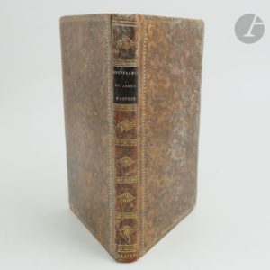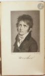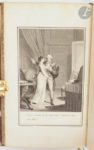 GOETHE (Johann Wolfgang von). Les Souffrances du jeune Werther. Traduction nouvelle. Paris : imprimerie de P. Didot l'aîné, 1809. — In-8, veau marbré, roulette dorée en encadrement sur les plats, dos lisse orné, tranches marbrées (reliure de l'époque). Seconde édition de la traduction française par Henri Huchet, comte de La Bédoyère (1782-1861), du premier roman de Gœthe dont le succès à l'époque de sa sortie en 1774 fut immense. La première version française fut publiée en 1776, dans la traduction du baron Karl Siegmund de Seckendorf. Se succédèrent d'autres traductions françaises dont l'une des plus estimées était celle de La Bédoyère, qui parut pour la première fois en 1804. L'édition est illustrée de trois planches gravées sur cuivre d'après Moreau le jeune. Exemplaire en reliure de l'époque, enrichi d'un portrait du jeune Werther gravé d'après une peinture de Boilly. Il s'agirait en vérité du portrait du fils du peintre. Traces blanches sur la reliure, petite fente aux charnières. Coins émoussés avec manques. Rousseurs éparses.