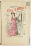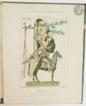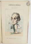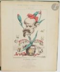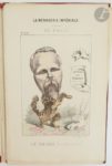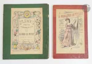 HADOL (Paul). La Ménagerie impériale composé des ruminants, amphibiens, carnivores et autres budgétivores qui ont dévoré la France. Paris : Rossignol, [vers 1870]. — Recueil in-4, en feuilles, sous chemise cartonnée de l'éditeur. Recueil composé d'un titre et de 31 planches en couleurs de Paul Hadol caricaturant Napoléon III, sa famille et diverses personnalités du Second Empire, sous la forme d'animaux. Usures et salissures à la chemise, manque les liens. Rousseurs sur le titre. On joint : - LE PETIT (Alfred). Fleurs, fruits & légumes du jour. Légendes de H. Briollet. Paris : Au bureau de L'Éclipse, 1871. — Album in-4, en feuilles, sous chemise cartonnée et illustrée de l'éditeur. Célèbre album de 31 caricatures d'Alfred Le Petit sur la guerre de 1870. Usures et salissures à la chemise, sans les liens. Manque le feuillet de titre.