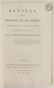 *JUVÉNAL - PERSE. Satires de Juvénal et de Perse, traduites en vers français, avec des notes ; Par F. Duboys-Lamolignère. Paris : Ch. Pougens, Colas, An IX (1801). — In-8, maroquin rouge, roulette dorée en encadrement sur les plats, dos lisse orné, monogramme PB doré en queue, roulette dorée intérieure, tranches dorées (reliure de l'époque). Première édition, dédiée à Bonaparte premier consul, de la traduction donnée par Dubois de Lamolignière, ancien conseiller au conseil supérieur de Saint-Domingue, des « Satires » de Juvénal et de Perse. L'ouvrage possède également une intéressante préface et des notes pour chaque satire. EXEMPLAIRE DE JOSÉPHINE, IMPÉRATRICE DES FRANÇAIS (1763-1814), avec le monogramme PB en queue du dos, provenant de la Malmaison. Ce monogramme PB apparut vers 1798. Sa signification fit beaucoup parler, c'est ce que rapporte Anne Lamort dans le catalogue de la vente Gérard Souham en 2008 : « Une analyse récente en proposait une lecture nouvelle : l'association B et P aurait été un message politique codé jouant avec les mots Buona Parte, le Bon Parti (Cf. « Livres précieux du Musée de la Malmaison », pp. 63-66). Quoiqu'intellectuellement plaisante, cette analyse semble indéfendable, si l'on s'en tient à la stricte présentation du chiffre : le P placé avant le B renvoie naturellement aux noms accolés de Joséphine avant et après son mariage Pagerie Bonaparte… Selon Mouravit, in « Napoléon bibliophile », ce monogramme aurait été inspiré par un lot de volumes offert par Pauline à son frère lors de son départ pour l'Égypte. Ces volumes étaient frappés au dos des initiales de Pauline Bonaparte et auraient constitué le noyau de la bibliothèque de la Malmaison » (Anne Lamort, in : « Collection Gérard Souham », vente du 7 décembre 2008, n° 21). Exemplaire sur papier vélin, très bien conservé malgré de discrètes et habiles restaurations aux coins et un petit manque sur le bord supérieur du premier plat. Provenance : A. Roux, à Montbéliard, avec ex-libris.
