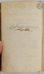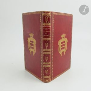 LAPOSTOLLE (Alexandre). Traité des parafoudres et des paragrêles en corde de paille, précédé d'une météorologie électrique, présentée sous un nouveau jour, et terminé par l'analyse de la bouteille de Leyde. Amiens : de l'imprimerie de Caron-Vitet, 1820. — In-8, 195 x 121 : (2 ff.), V pp., (1 f.), 320 pp., (1 f.), 1 planche. Maroquin rouge à long grain, roulette dorée en encadrement et armes dorées au centre sur les plats, dos lisse orné, roulette dorée intérieure, tranches dorées (reliure de l'époque). Édition originale. Alexandre Lapostolle (1749-1831) était un célèbre pharmacien, professeur de physique et de chimie à l'École centrale, au Jardin du roi et à l'École préparatoire de médecine d'Amiens. Lorsqu'il publia cet ouvrage il était déjà âgé de plus de 70 ans et fut déjà apprécié pour les recherches qu'il avait effectuées sur la carie du blé, les engrais, la conservation des pommes de terre, la betterave champêtre, l'extraction du sucre, la taxe du pain d'après le prix des farines, les dangers des batteries de cuisine en cuivre et la valeur alimentaire des champignons. Dans cet ouvrage, il s'attache à indiquer la construction d'appareils destinés à préserver les habitations de la foudre et à mettre les champs à l'abri de la grêle. Ses découvertes étaient destinées au plus grand nombre, c'est pour cela qu'il dédia son étude « Aux Nations de l'Europe ». Le travail de Lapostolle eut l'avantage d'obliger l'Institut à s'occuper du problème des paragrêles ; il fut malheureusement critiqué et rejeté par le physicien Biot et par Gay-Lussac. Malgré cela les appareils imaginés par Lapostolle eurent un grand succès et furent même introduits en Italie en 1823, puis en Allemagne et même aux États-Unis. L'édition est illustrée d'une belle lithographie dépliante hors texte, représentant une « Vue d'une Plaine armée de Paragrêles, et d'un Village armé de Parafoudres ». On trouve également un grand tableau dépliant correspondant à la page 212, donnant le « Parallèle des expériences Qui constatent les divers degrés de conductibilité des substances métaliques, et de la paille, dans les phénomènes électriques ». Très bel exemplaire aux armes supposées du marquis d'Allonville. L'exemplaire est bien complet de la signature autographe de l'auteur au verso du titre. On trouve également sur ce dernier une note ancienne relative à la réponse de Biot ainsi que le cachet ancien de la paroisse Saint-Honoré, répété sur deux autres feuillets. Quelques petits frottements d'usage, un coin émoussé. Rousseurs éparses.