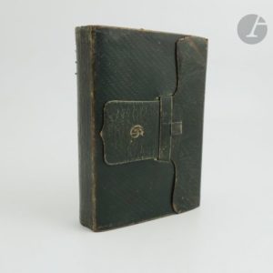 LIVRE DE POSTE contenant, 1° La désignation des relais de poste du royaume, et la fixation des distances en myriamètres et kilomètres ; 2° L'indication des relais placés sur les routes étrangères, à partir des frontières de France ; 3° Le tableau du service des paquebots de la Méditerranée. Pour l'an 1840. Deuxième édition. Paris : imprimerie royale, Avril 1840. — In-8, demi-basane verte, dos lisse, dans une chemise-étui en maroquin vert sombre à rabats, avec compartiments à l'intérieur pour des cartes et un crayon. Bon exemplaire de ce livre de poste dans son étui d'origine. On trouve à la fin plusieurs feuillets couverts de notes de compte de voyages de l'époque, concernant notamment un voyage de Paris à Châteauroux avec 4 chevaux et 2 postillons, de Fontenoy à Paris, etc. Un page comprend la liste et le prix des voyages effectués en novembre 1843. Une grande partie des autres feuillets destinés aux notes ont été découpées. Lettre G dorée sur le rabat de l'étui. Défauts d'usage à l'étui. Mouillure avec de légers manques à l'angle inférieur des derniers feuillets et du second plat. Sans carte.