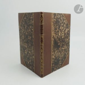 MONNIER (Antoine). Eaux-fortes et rêves creux. Sonnets excentriques et poèmes étranges. Paris : Librairie Léon Willem, 1873. — In-8, demi-maroquin brun à coins, filets dorés, dos à nerfs orné, tête dorée, non rogné, étui (reliure de l'époque). Édition originale de ce recueil poétique du poète et graveur Antoine Monnier, illustrée par l'auteur de 20 eaux-fortes originales hors texte à la fois symbolistes et fantastiques. Tirage à 350 exemplaires. Celui-ci est l'un des 30 sur papier de Chine, comprenant deux états des gravures, en bistre et en noir. Très bel exemplaire, bien conservé malgré des rousseurs et de légers frottements aux coiffes. Étui abîmé.