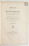 MONTESQUIEU. Œuvres de Montesquieu, ses éloges par d'Alembert et M. Villemain, les notes d'Helvétius, de Condorcet et de Voltaire ; suivies du commentaire sur L'Esprit des lois, par M. le comte Destutt de Tracy. Paris : Dalibon, 1822. — 8 volumes in-8, demi-maroquin citron, chiffre doré au centre du premier plat, dos à nerfs orné de motifs dorés et mosaïqués, non rogné (Dauphin). Belle édition des œuvres de Montesquieu UN DES RARES EXEMPLAIRES SUR PAPIER VÉLIN, en grande partie non coupé, DANS UNE SUPERBE RELIURE DE L'ÉPOQUE SIGNÉE DE PIERRE DAUPHIN, relieur lyonnais qui exerça durant le premier tiers du XIXe siècle. Il manque le fac-similé d'autographe de Montesquieu et le portrait de celui-ci gravé par Müller d'après Deveria. Ils ont été retirés pour être remplacés par un portrait de l'auteur gravé par Pierre-Alexandre Tardieu d'après Antoine-Denis Chaudet (1763-1810) tiré sur chine collé, ainsi que d'une suite de onze planches en état avant la lettre sur chine collé. Rousseurs et quelques rares traces de mouillures. Provenance : chiffre JLR doré sur les plats. - Dr E. F. avec étiquette imprimée collée à l'angle supérieur des contreplats.